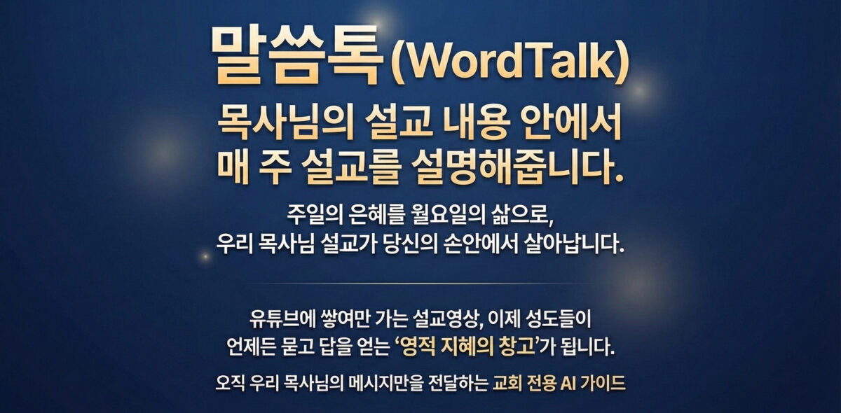 & 설교설명-말씀톡이란? 목사님의 설교 말씀을 매 주 학습하여 성도들의 설교와 말씀에 대한 질문을 학습한 설교 말씀만 기준으로 응답해주는 챗봇 기반의 서비스입니다. 매일매일 우리교회 담임 목사님의 설교 말씀과 함께하는 하루 10분 말씀 읽기/쓰기 도 알아보세요.